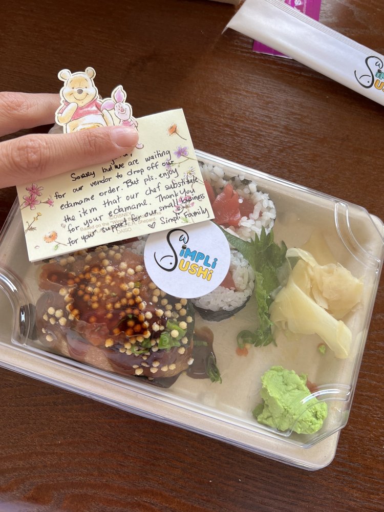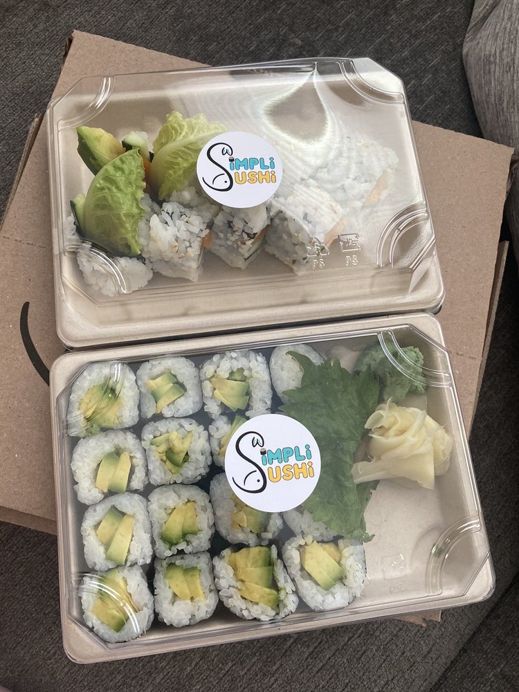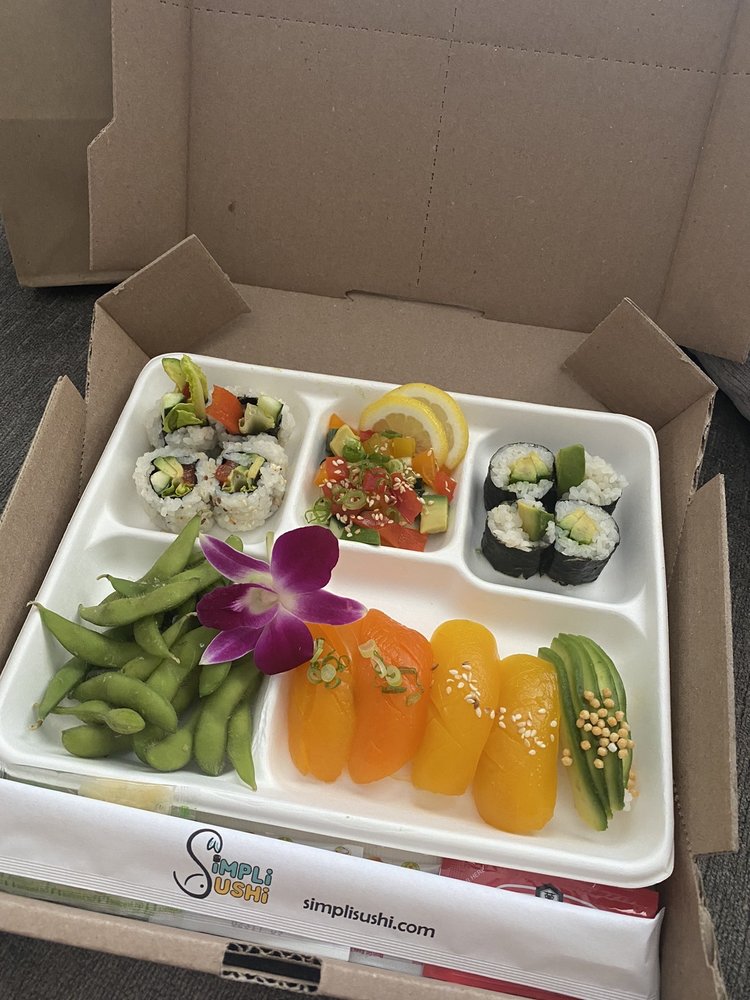 Nigiri: 2pc Vegan Tuna, 2pc Vegan Salmon, 1pc Avocado/NoriCut Rolls: 4pc Avocado Hoso Maki, 4pc Veggie RollEach Bento comes with Simpli Poke, Organic edamame, Soy sauce, Ginger, Wasabi, and a set of chopsticks