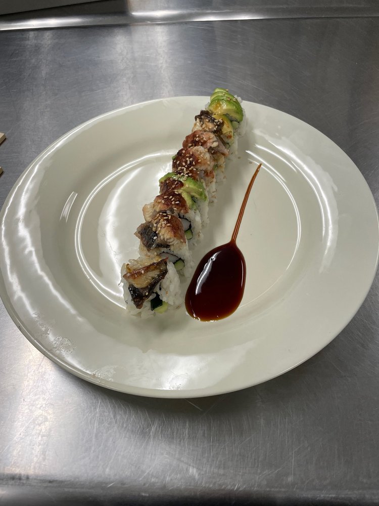 Shrimp tempura, avocado, unagi sauce, sushi rice, seaweed, and sesame seed.