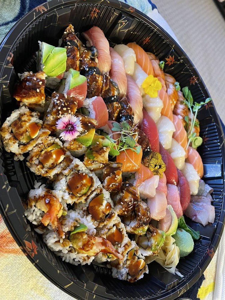 Nigiri: 4pc Tuna, 4pc Salmon, 4pc Yellowtail, 4pc UnagiCut Rolls: 8pc California, 8pc Spicy Tuna, 8pc Salmon Avocado, 8pc RainbowEach Platter comes with Soy Sauce, Ginger, Wasabi, and Chopsticks. Serves 2 to 3 people