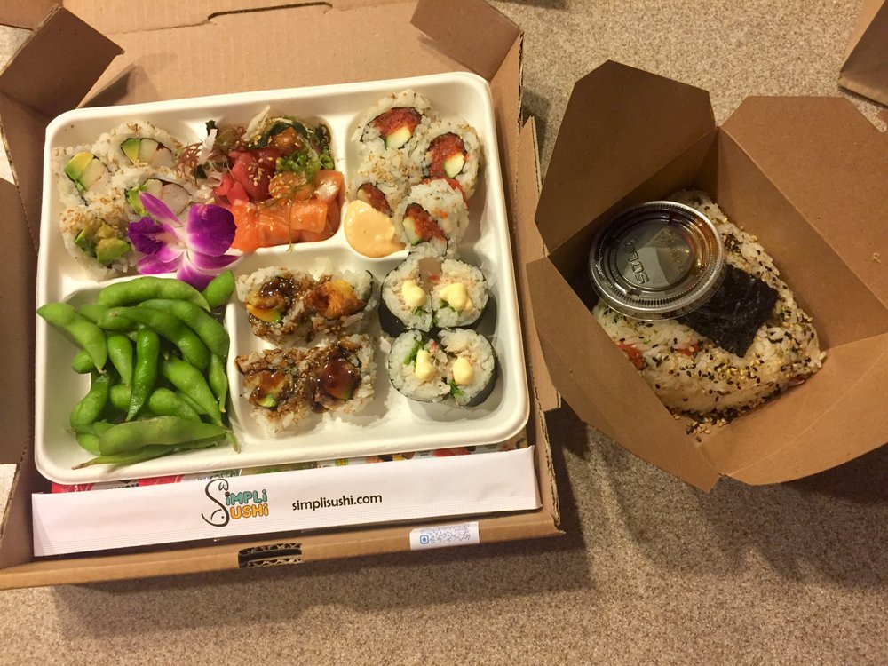 4pc Blue Crab Roll, 4 pc California Roll, 4pc of Spicy Tuna Roll, 4pc Shrimp Tempura RollEach Bento comes with Simpli Poke, Organic Edamame, Soy sauce, Ginger, Wasabi, and a set of chopsticks