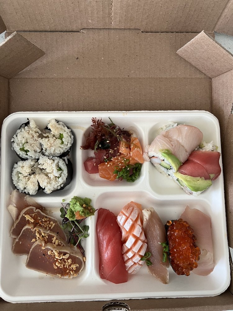 Nigiri: 1pc each of Tuna, Salmon, Yellowtail, Albacore, IkuraCut Rolls: 4pc Blue Crab Maki, 4pc Rainbow RollEach Bento comes with Simpli Poke, Organic edamame, Soy sauce, Ginger, Wasabi, and a set of chopsticks