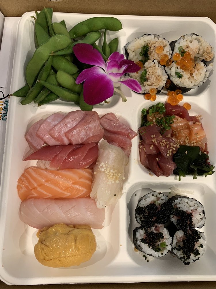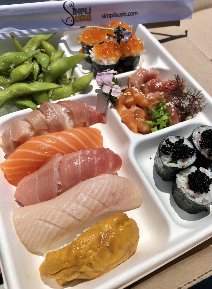 Nigiri: 1pc each of Toro, Uni, Tuna, Salmon, YellowtailCut Rolls: 4pc Blue Crab Maki with Ikura, 4pc Negi Toro MakiEach Bento comes with Simpli Poke, Organic Edamame, Soy sauce, Ginger, Wasabi, and a set of chopsticks